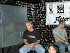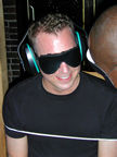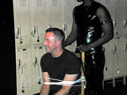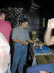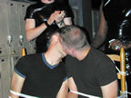 On the evening of August 19th, our friends Russ and Rono arrived at our door, dressed all in black, wearing masks. They put handcuffs on us, and then led us to their car where they added blindfolds. They drove us around for a while, then made us walk down a block and across a street (still blindfolded!). We then entered a building, were led to the back, and then tied to two chairs. At this point the blindfolds came off and we saw about two dozen of our friends cheering. They then proceeded to ask us a set of questions separately, then we were re-united and they compared our answers. Sort of a gay Newlywed Game. We actually did better than most people thought we would!